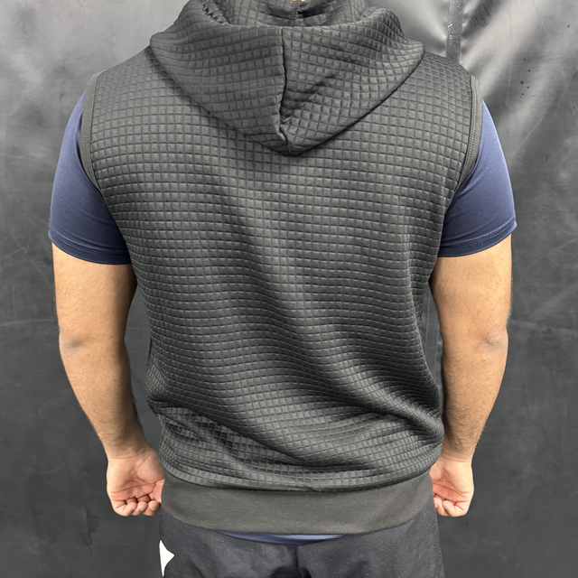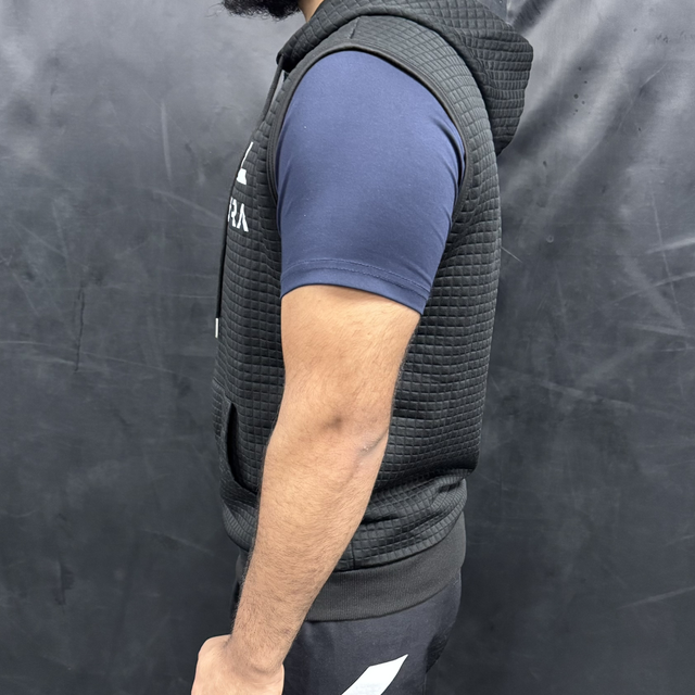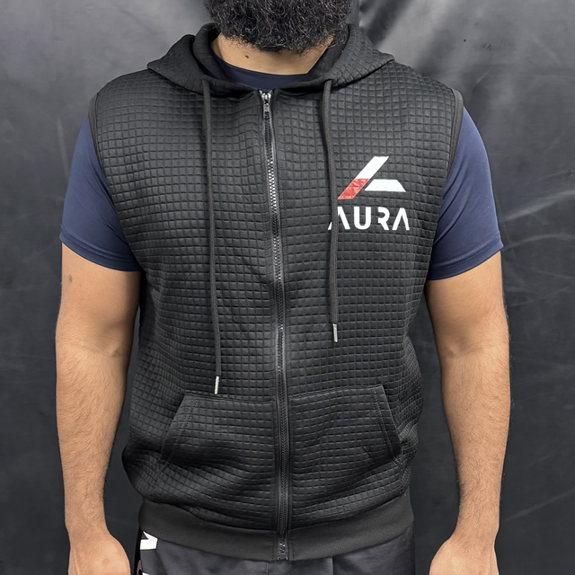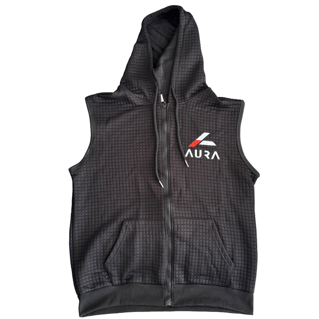 Sleeveless zip hoodie, simple, neat design with the sleek Aura logo stickered on the chest